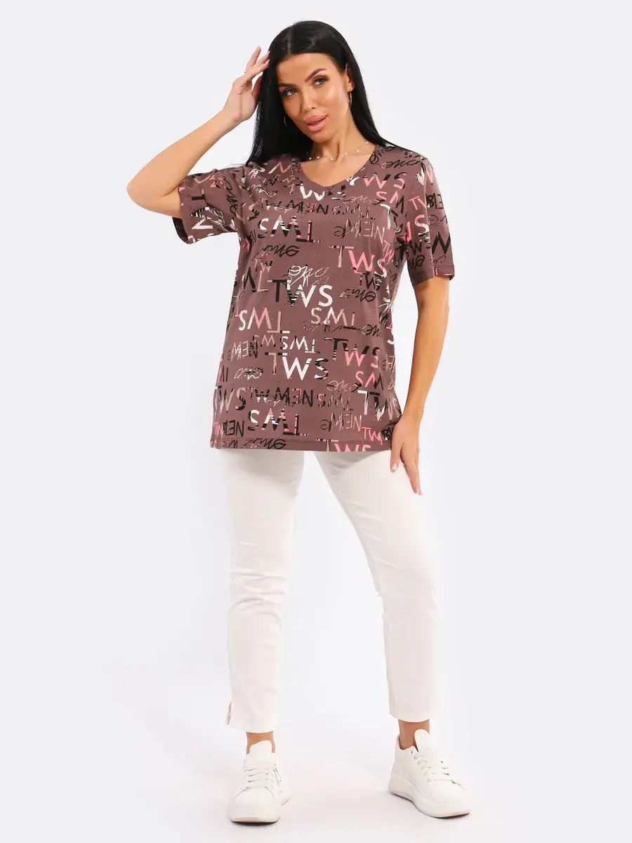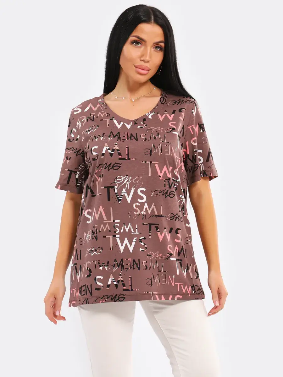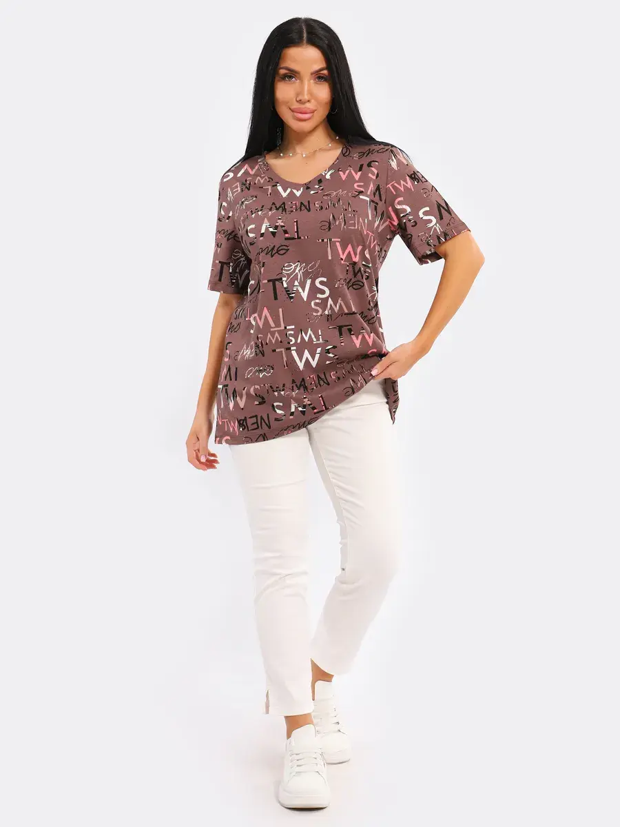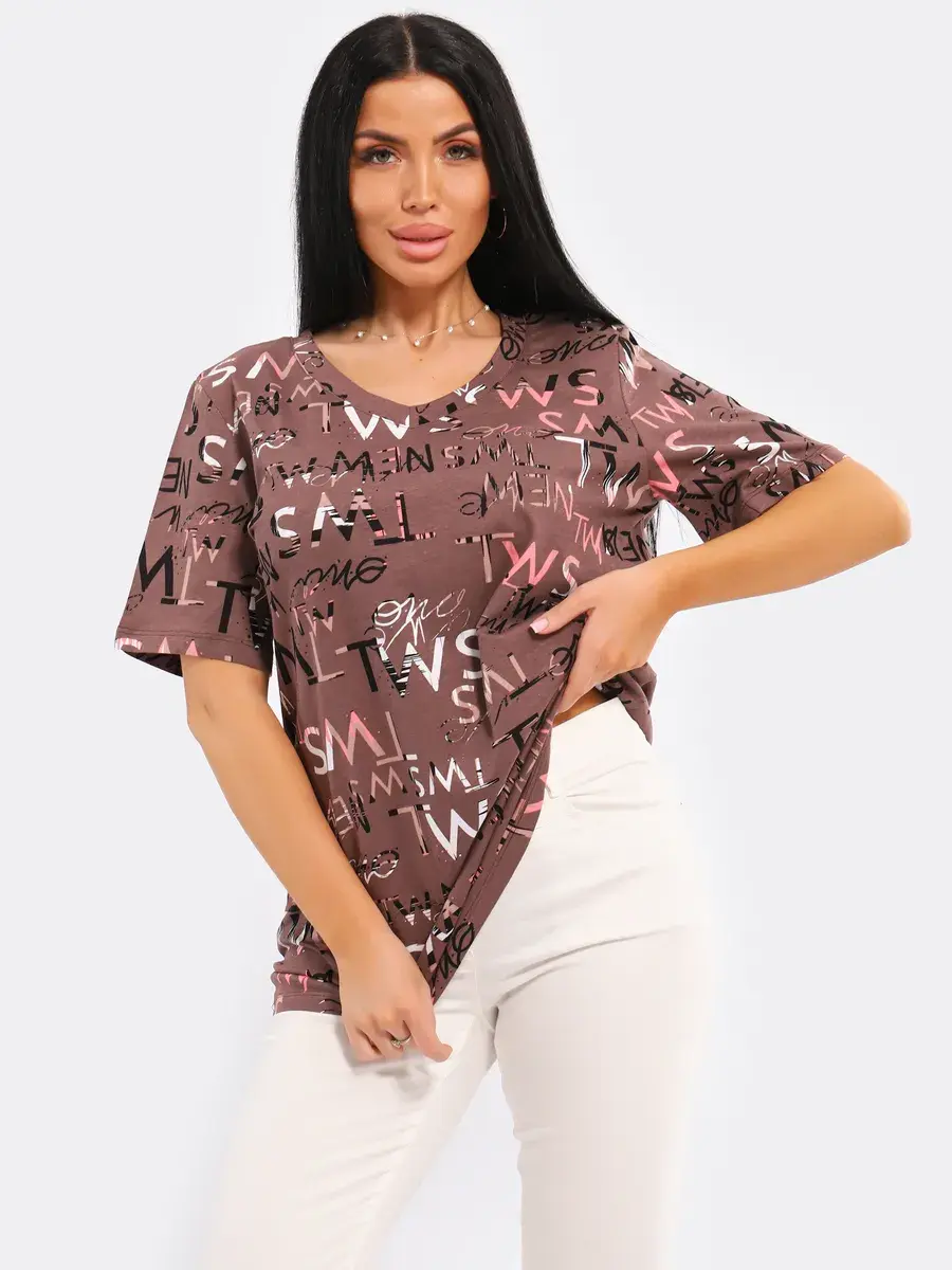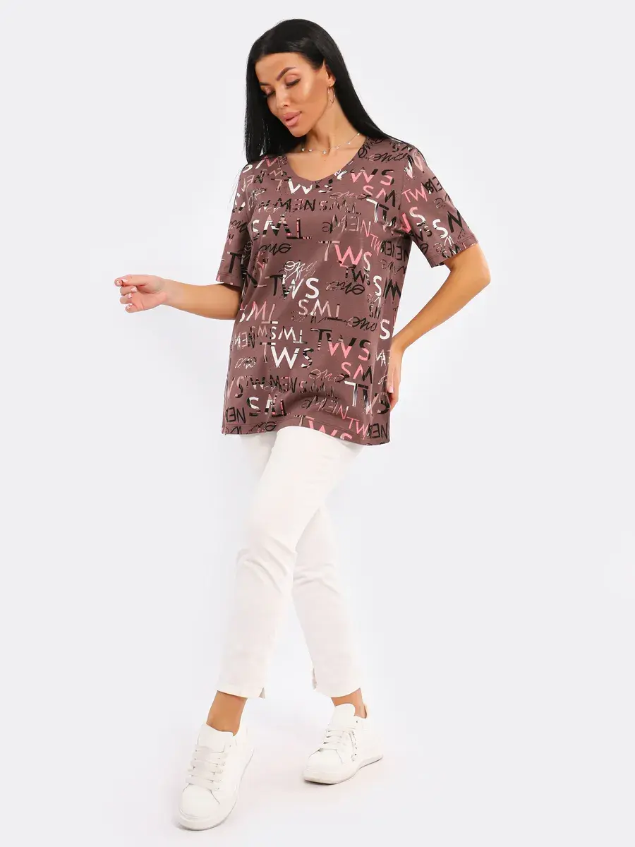 Футболка женская из хлопка с лайкрой, производства Турции. Модель футболки удлинённая с V-образной горловиной, подойдет на любой тип фигуры. Модный принт на ткани футболки будет отлично сочетаться с любым низом. Футболка свободная имеет широкий размерный ряд с 48 по 70 размер, позволит подобрать Вам подходящий размер. Желаем удачных покупок!