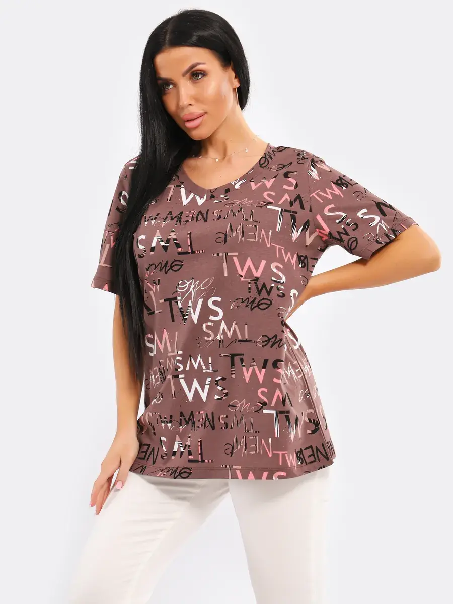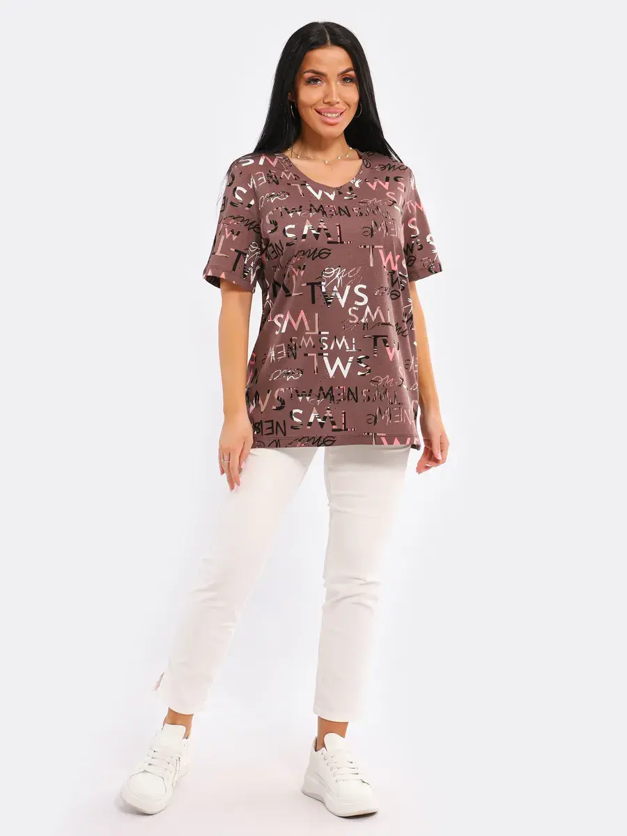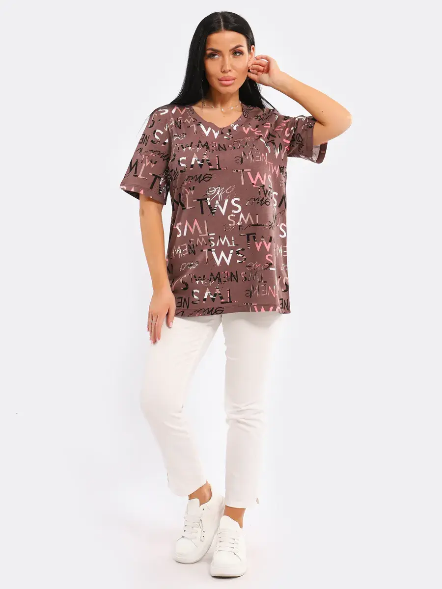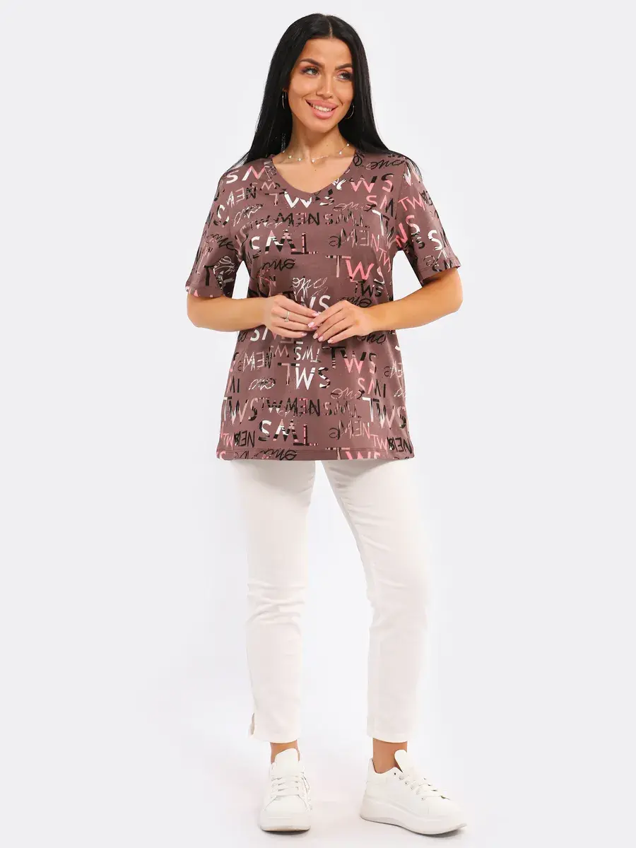 Футболка женская из хлопка с лайкрой, производства Турции. Модель футболки удлинённая с V-образной горловиной, подойдет на любой тип фигуры. Модный принт на ткани футболки будет отлично сочетаться с любым низом. Футболка свободная имеет широкий размерный ряд с 48 по 70 размер, позволит подобрать Вам подходящий размер. Желаем удачных покупок!