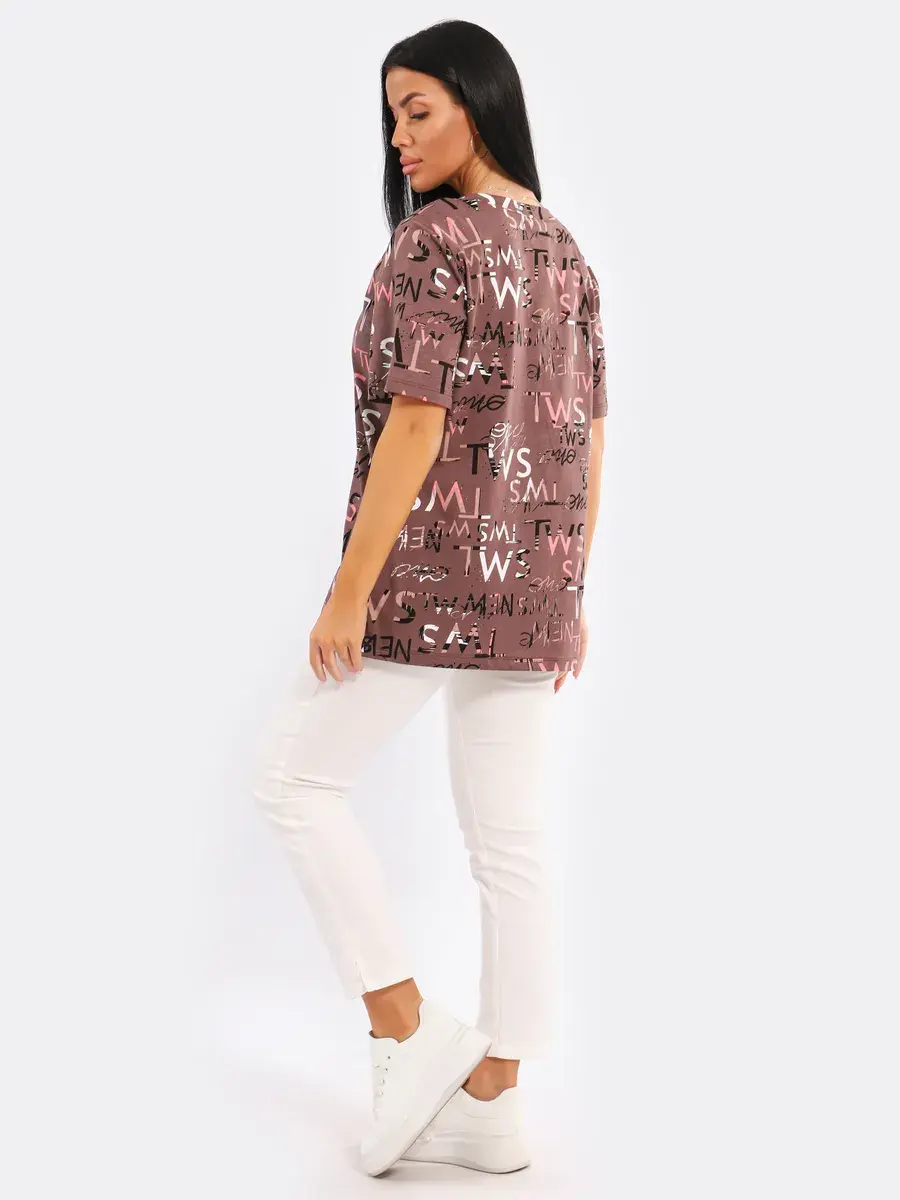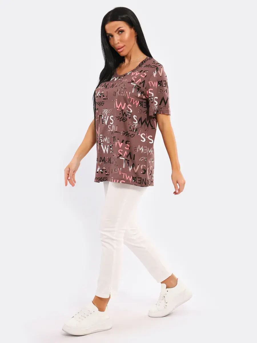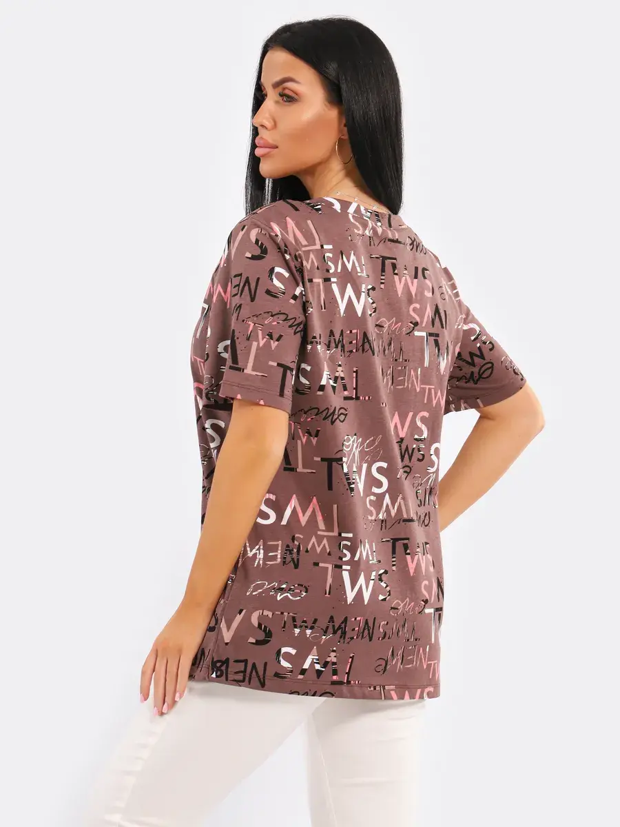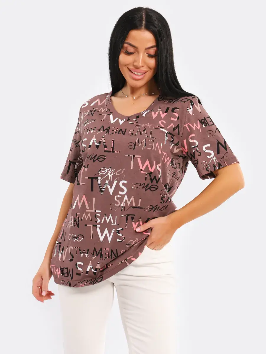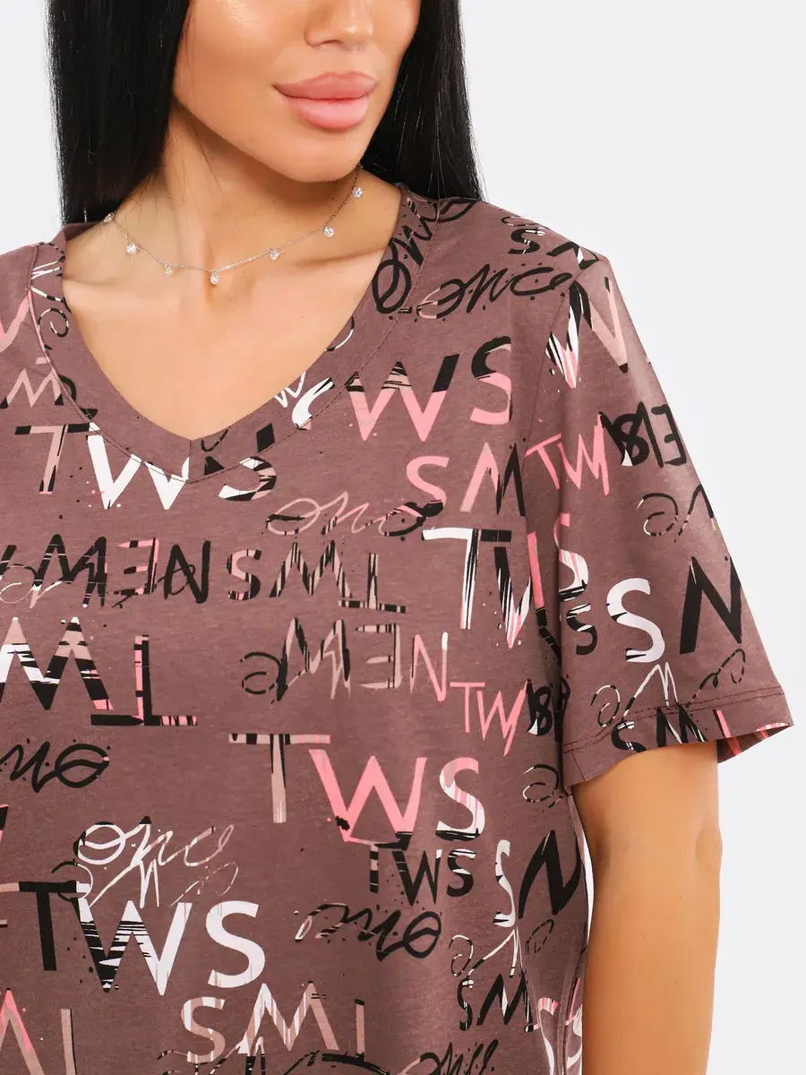Футболка женская из хлопка с лайкрой, производства Турции. Модель футболки удлинённая с V-образной горловиной, подойдет на любой тип фигуры. Модный принт на ткани футболки будет отлично сочетаться с любым низом. Футболка свободная имеет широкий размерный ряд с 48 по 70 размер, позволит подобрать Вам подходящий размер. Желаем удачных покупок!