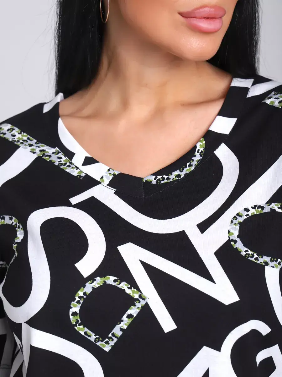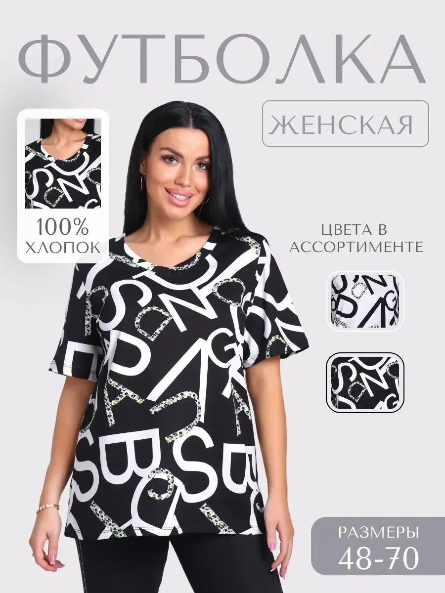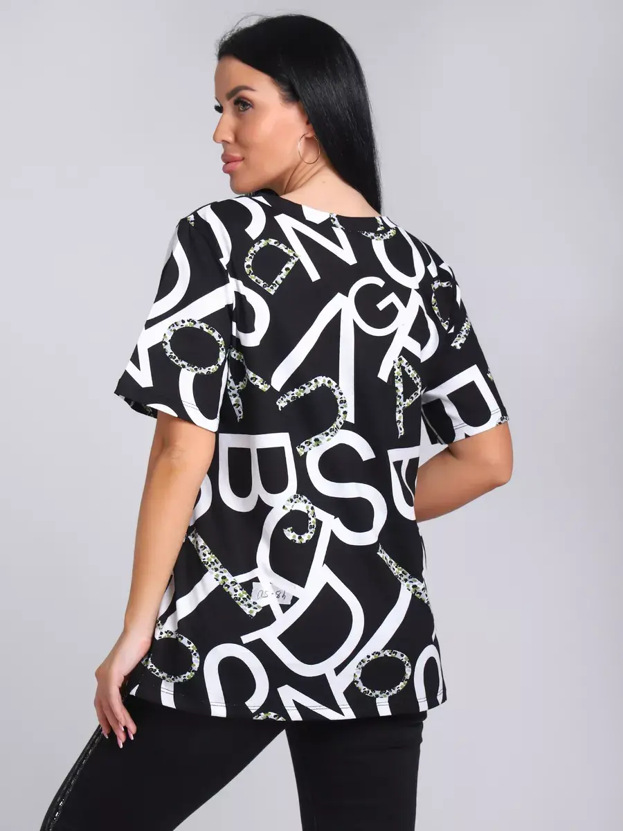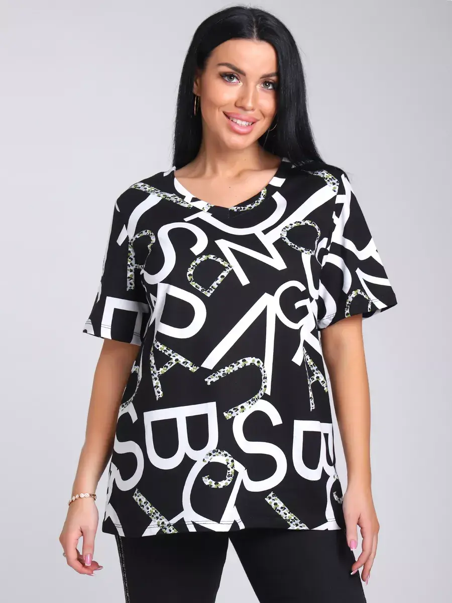 Футболка женская из хлопка с лайкрой, производства Турции. Модель футболки удлинённая с V-образной горловиной, подойдет на любой тип фигуры. Модный принт на ткани футболки будет отлично сочетаться с любым низом. Футболка свободная имеет широкий размерный ряд с 48 по 70 размер, позволит подобрать Вам подходящий размер. Желаем удачных покупок!