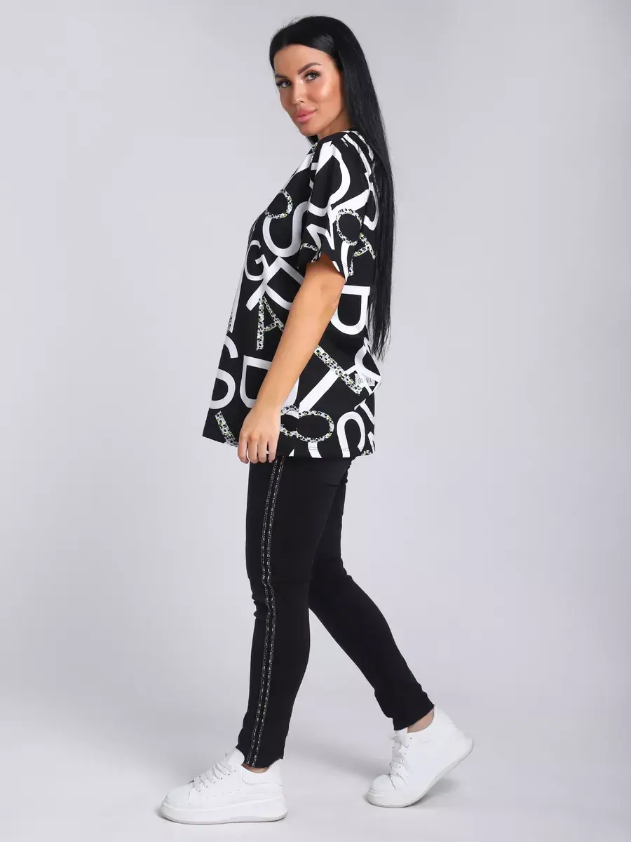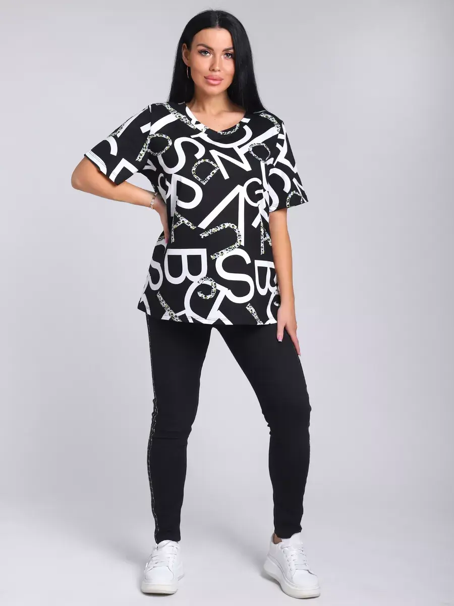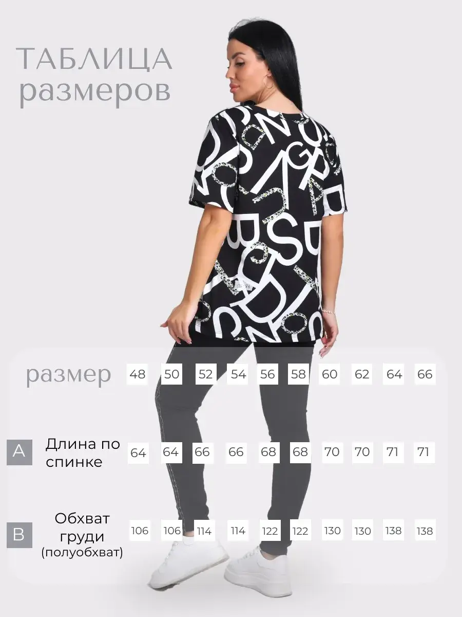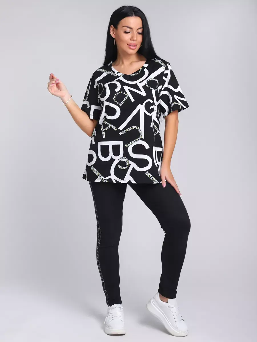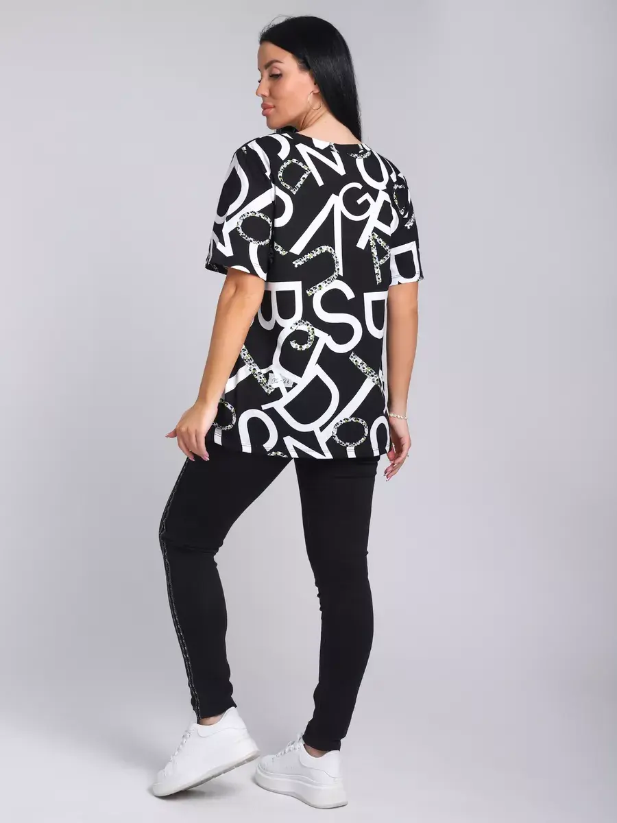 Футболка женская из хлопка с лайкрой, производства Турции. Модель футболки удлинённая с V-образной горловиной, подойдет на любой тип фигуры. Модный принт на ткани футболки будет отлично сочетаться с любым низом. Футболка свободная имеет широкий размерный ряд с 48 по 70 размер, позволит подобрать Вам подходящий размер. Желаем удачных покупок!