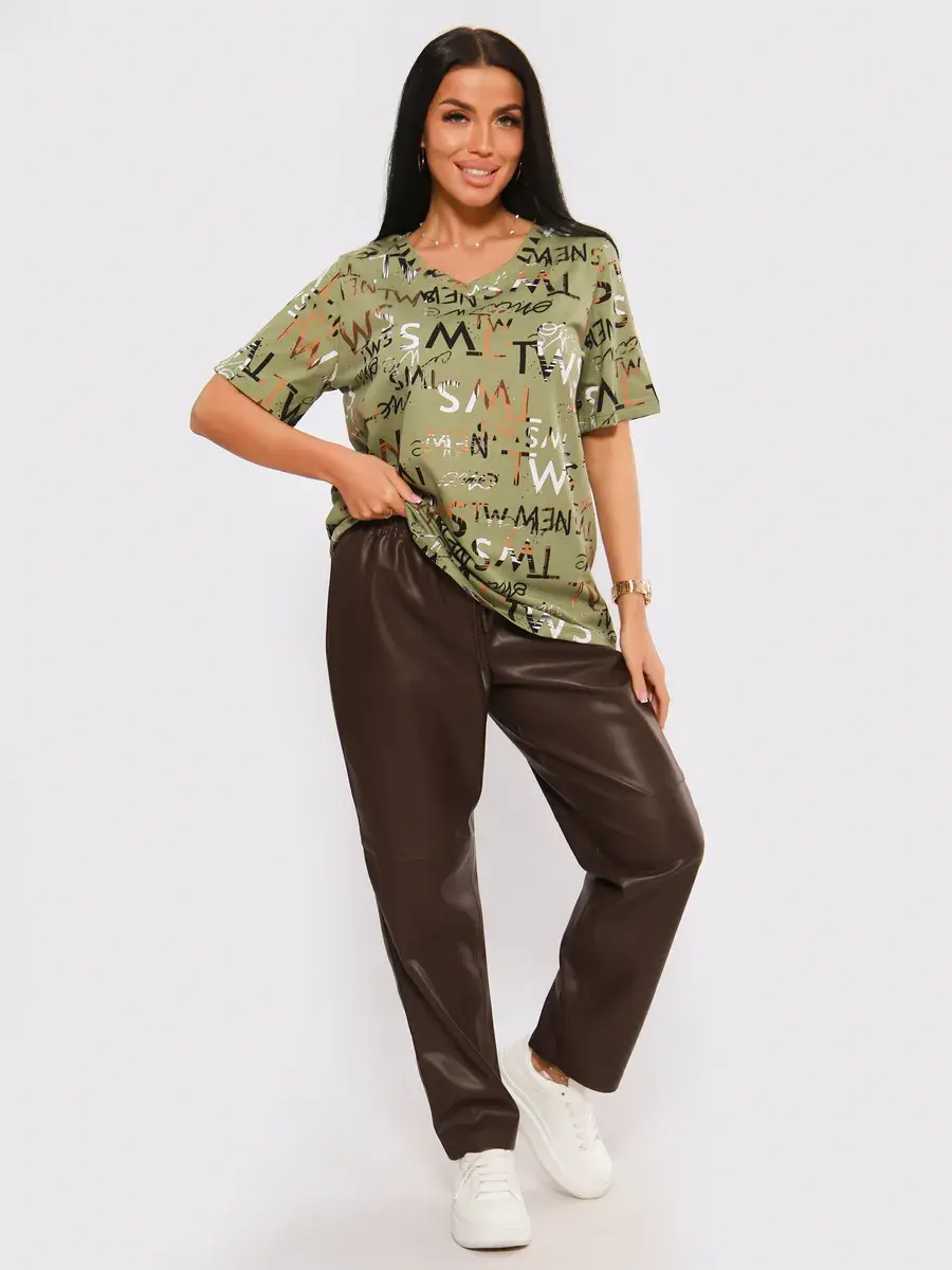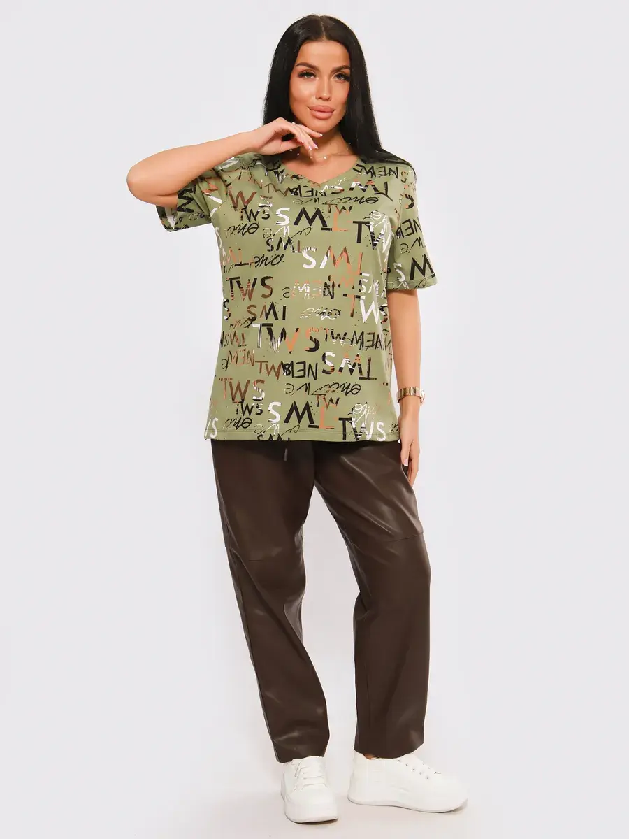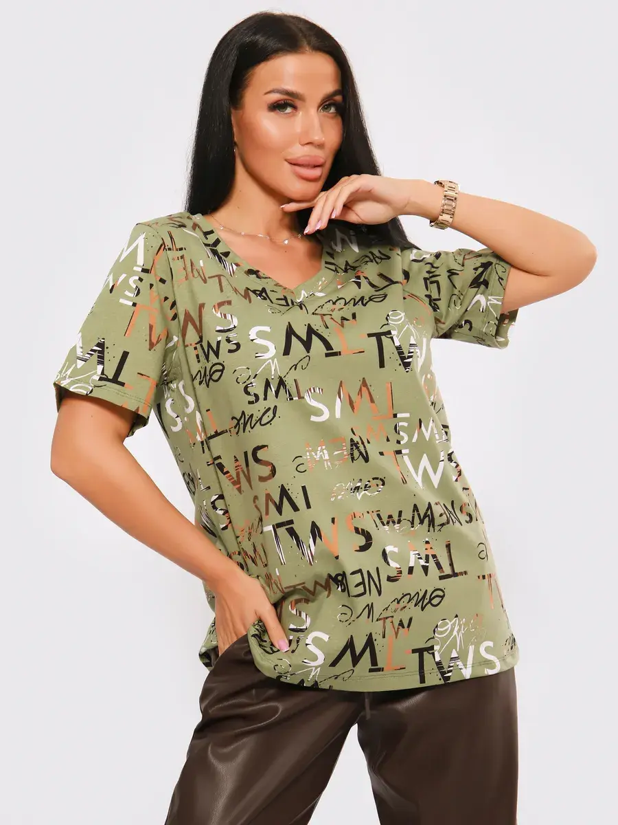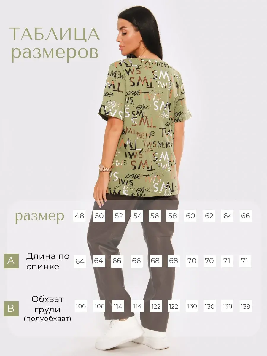 Футболка женская из хлопка с лайкрой, производства Турции. Модель футболки удлинённая с V-образной горловиной, подойдет на любой тип фигуры. Модный принт на ткани футболки будет отлично сочетаться с любым низом. Футболка свободная имеет широкий размерный ряд с 48 по 70 размер, позволит подобрать Вам подходящий размер. Желаем удачных покупок!