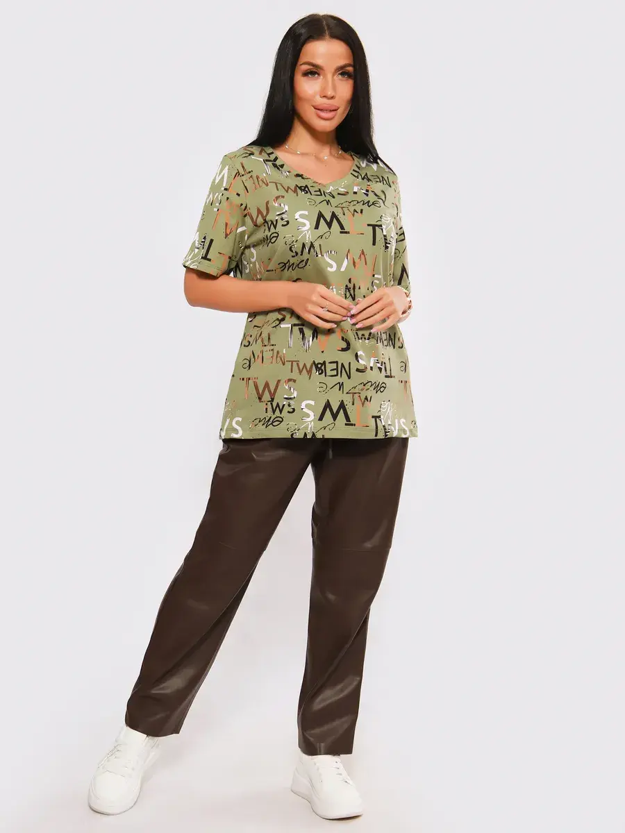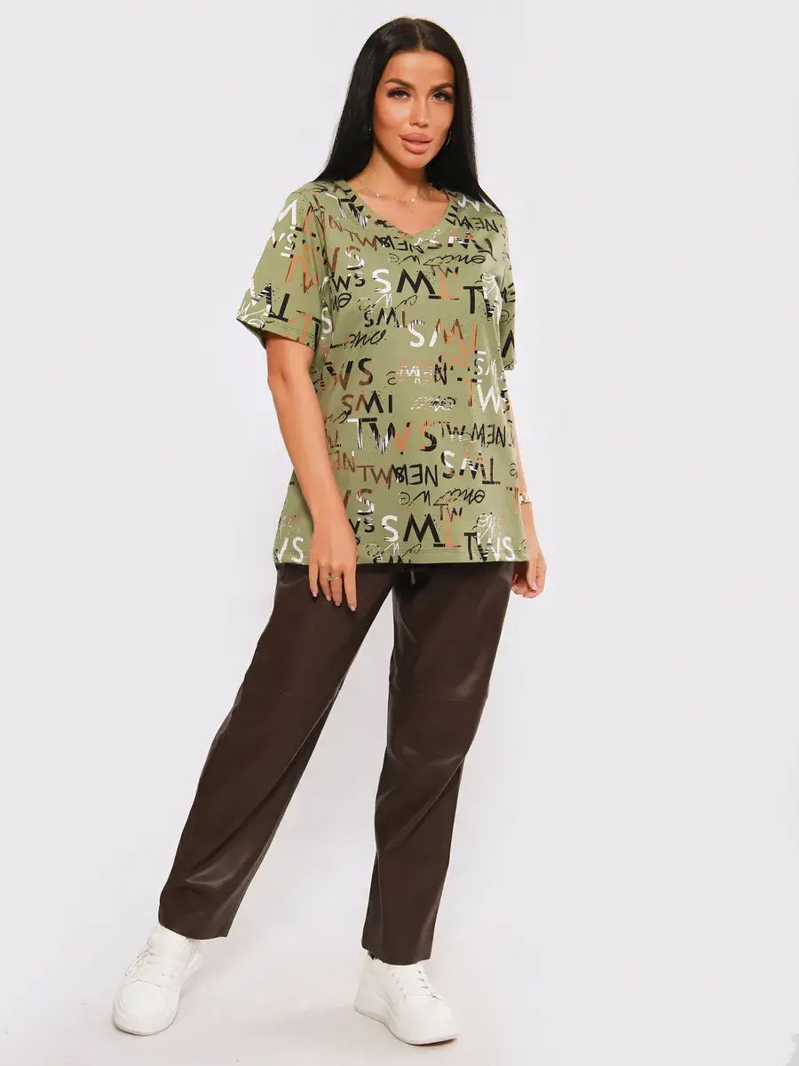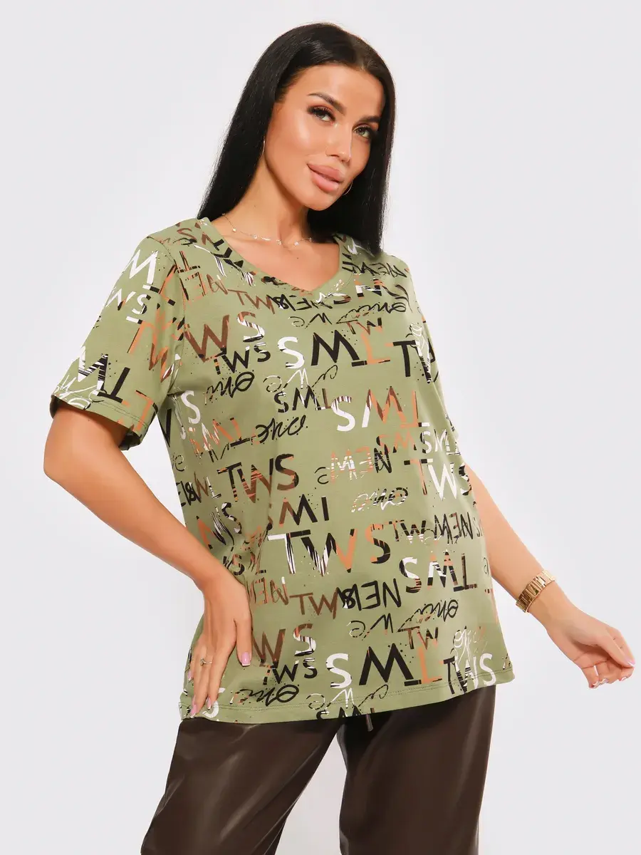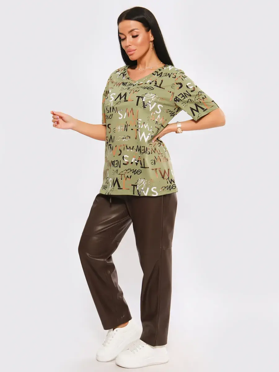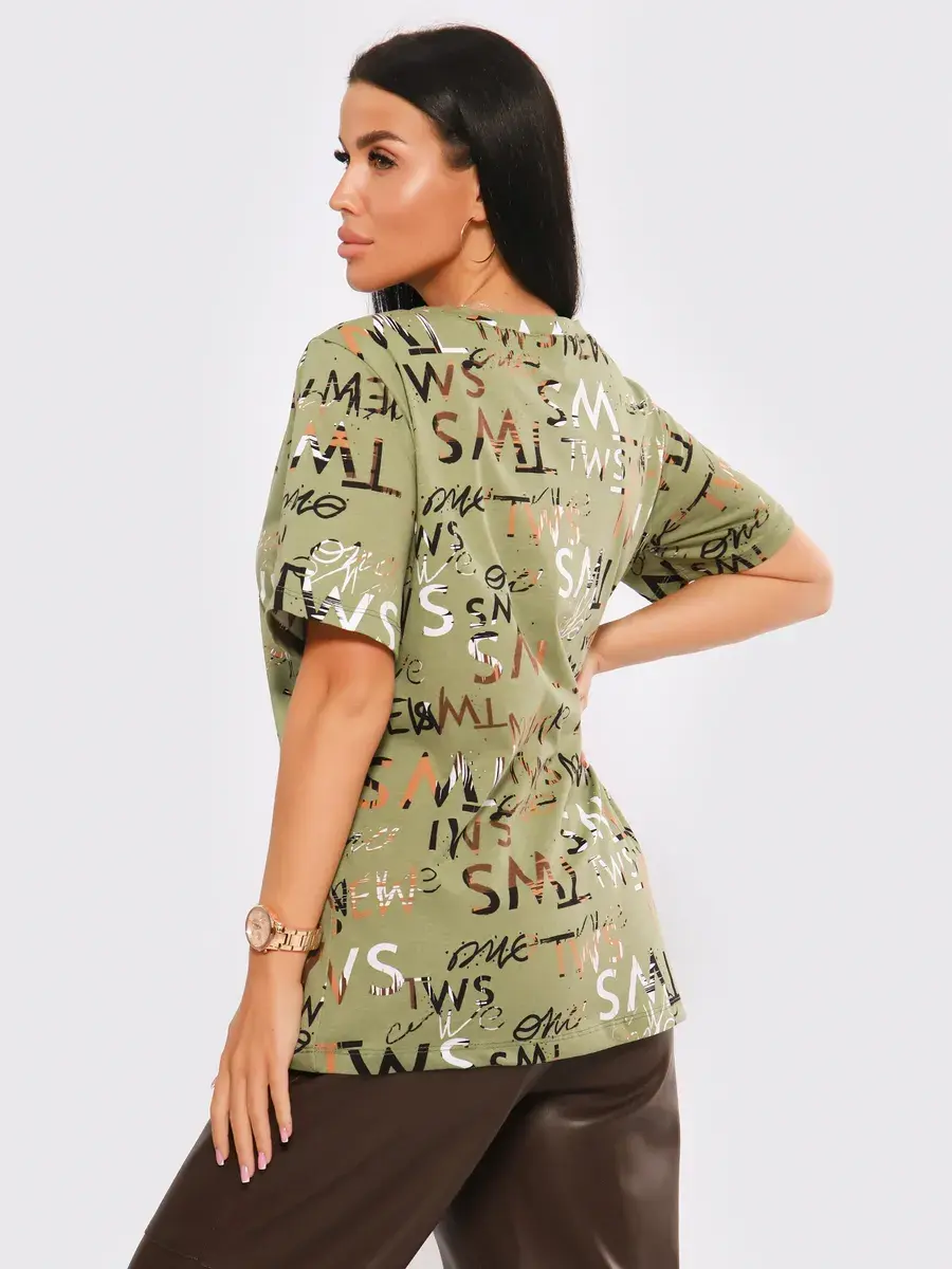 Футболка женская из хлопка с лайкрой, производства Турции. Модель футболки удлинённая с V-образной горловиной, подойдет на любой тип фигуры. Модный принт на ткани футболки будет отлично сочетаться с любым низом. Футболка свободная имеет широкий размерный ряд с 48 по 70 размер, позволит подобрать Вам подходящий размер. Желаем удачных покупок!