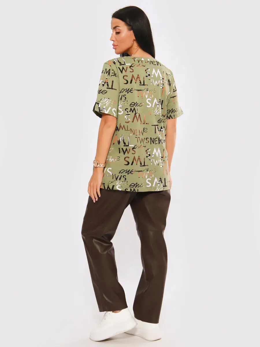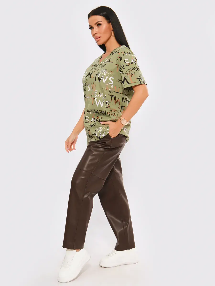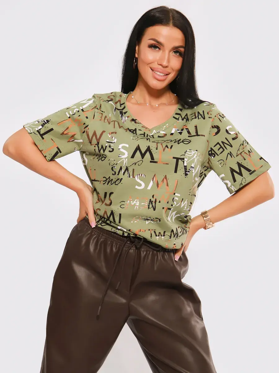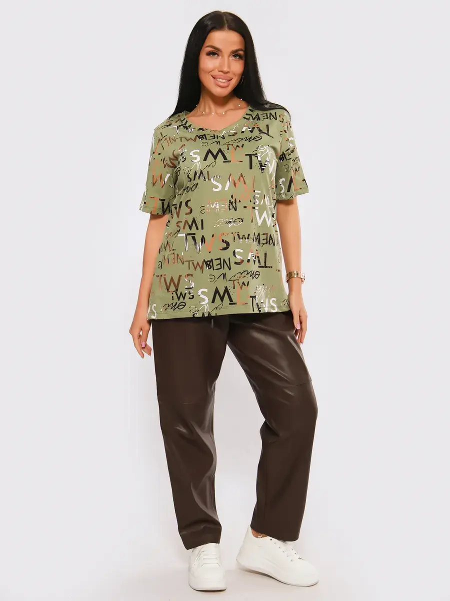 Футболка женская из хлопка с лайкрой, производства Турции. Модель футболки удлинённая с V-образной горловиной, подойдет на любой тип фигуры. Модный принт на ткани футболки будет отлично сочетаться с любым низом. Футболка свободная имеет широкий размерный ряд с 48 по 70 размер, позволит подобрать Вам подходящий размер. Желаем удачных покупок!