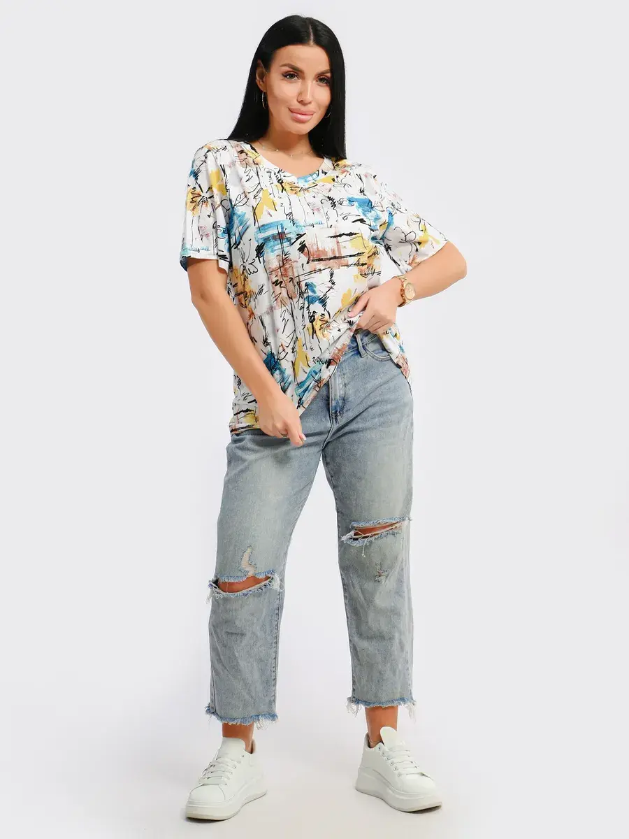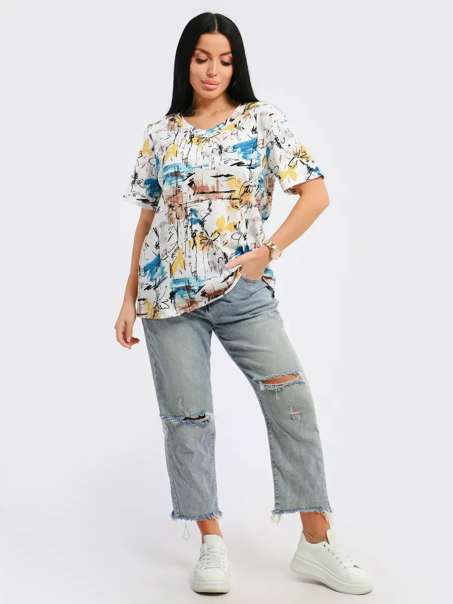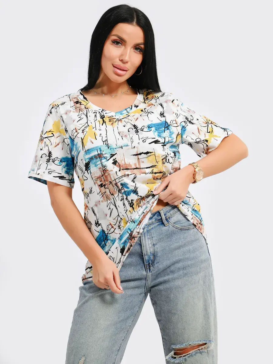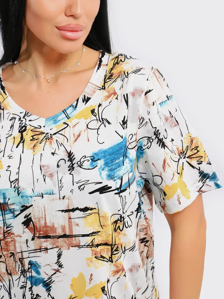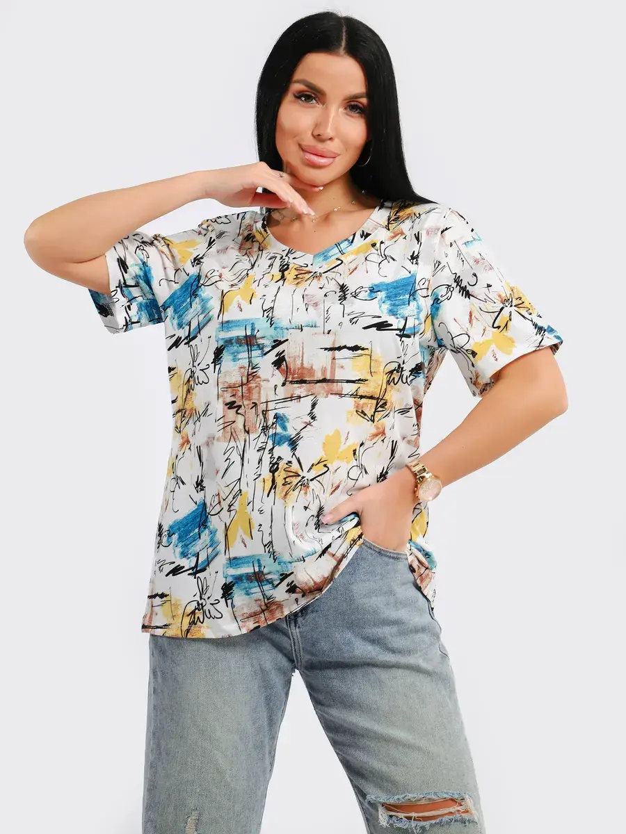 Футболка женская из хлопка с лайкрой, производства Турции. Модель футболки удлинённая с V-образной горловиной, подойдет на любой тип фигуры. Модный принт на ткани футболки будет отлично сочетаться с любым низом. Футболка свободная имеет широкий размерный ряд с 48 по 70 размер, позволит подобрать Вам подходящий размер. Желаем удачных покупок!