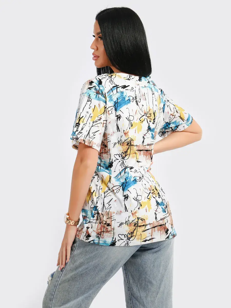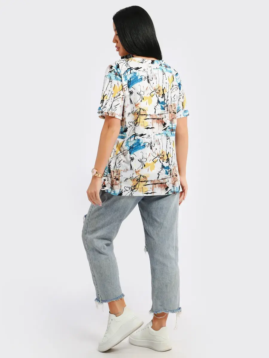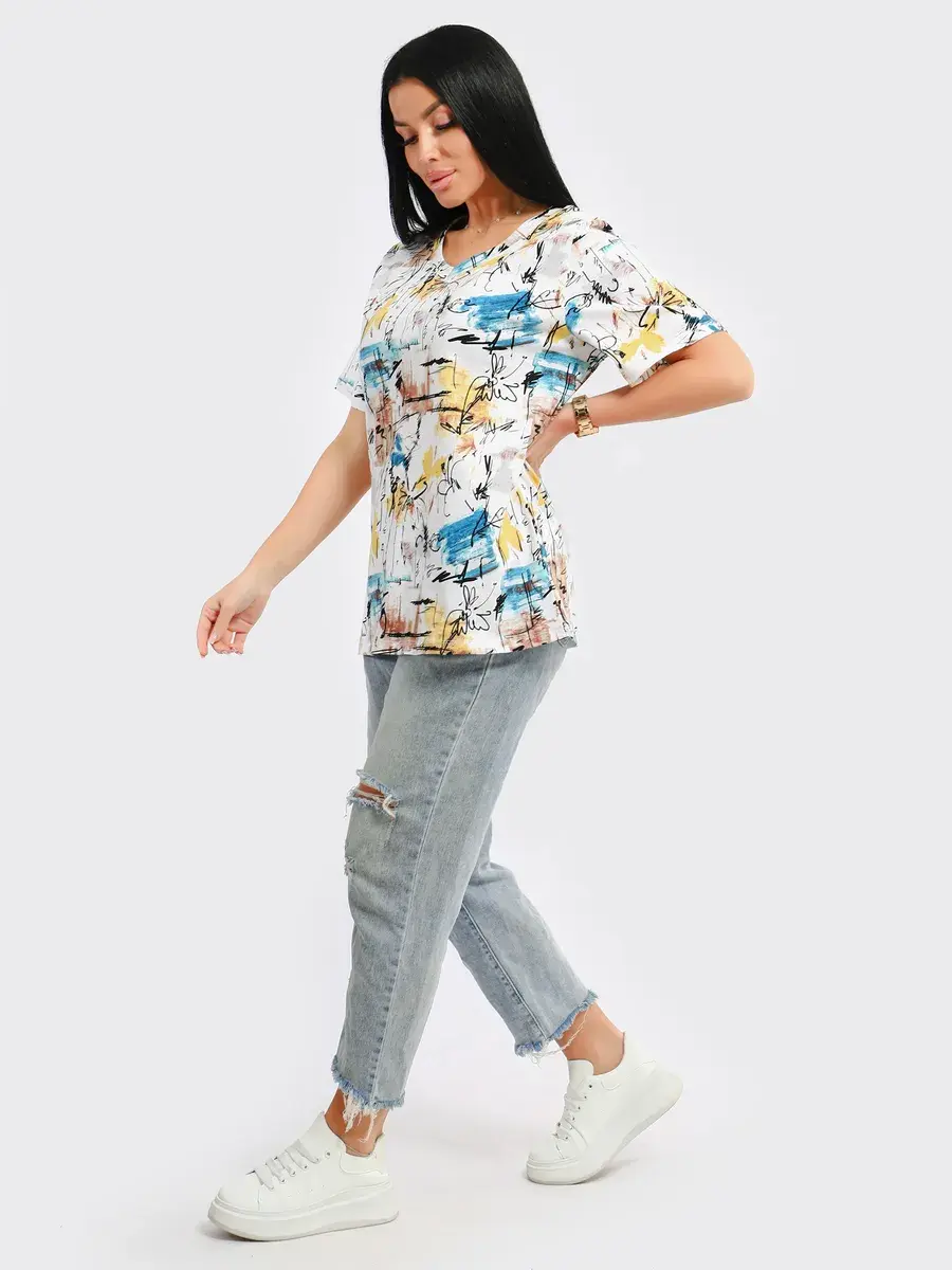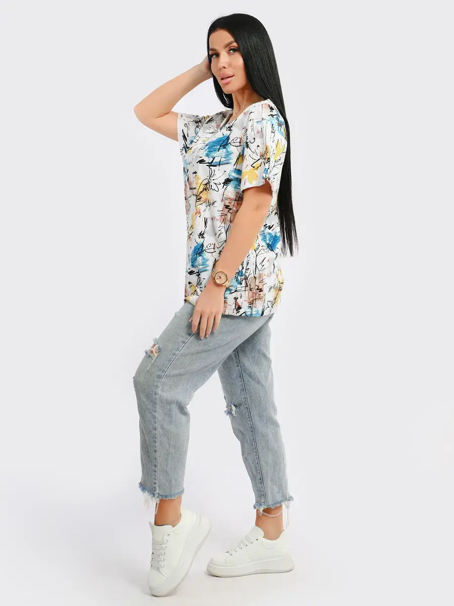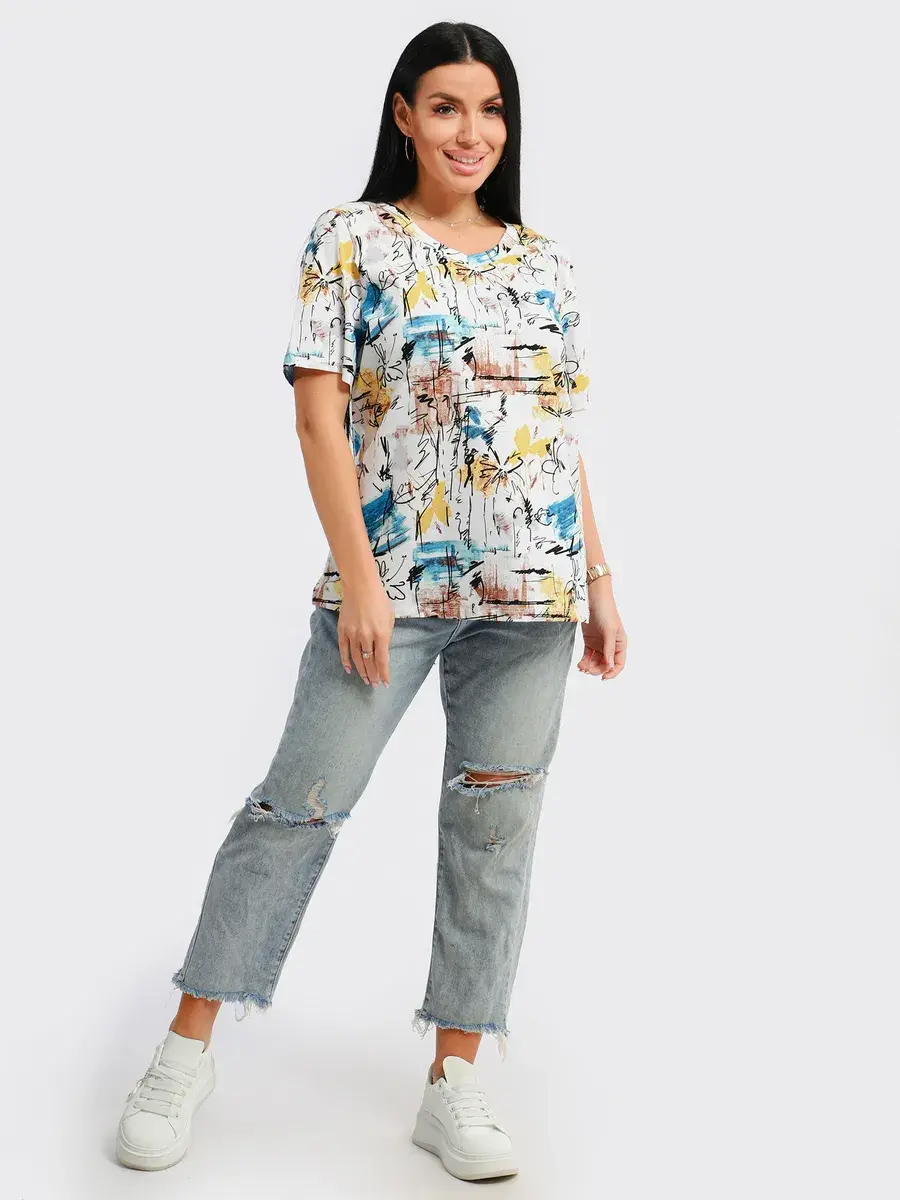 Футболка женская из хлопка с лайкрой, производства Турции. Модель футболки удлинённая с V-образной горловиной, подойдет на любой тип фигуры. Модный принт на ткани футболки будет отлично сочетаться с любым низом. Футболка свободная имеет широкий размерный ряд с 48 по 70 размер, позволит подобрать Вам подходящий размер. Желаем удачных покупок!