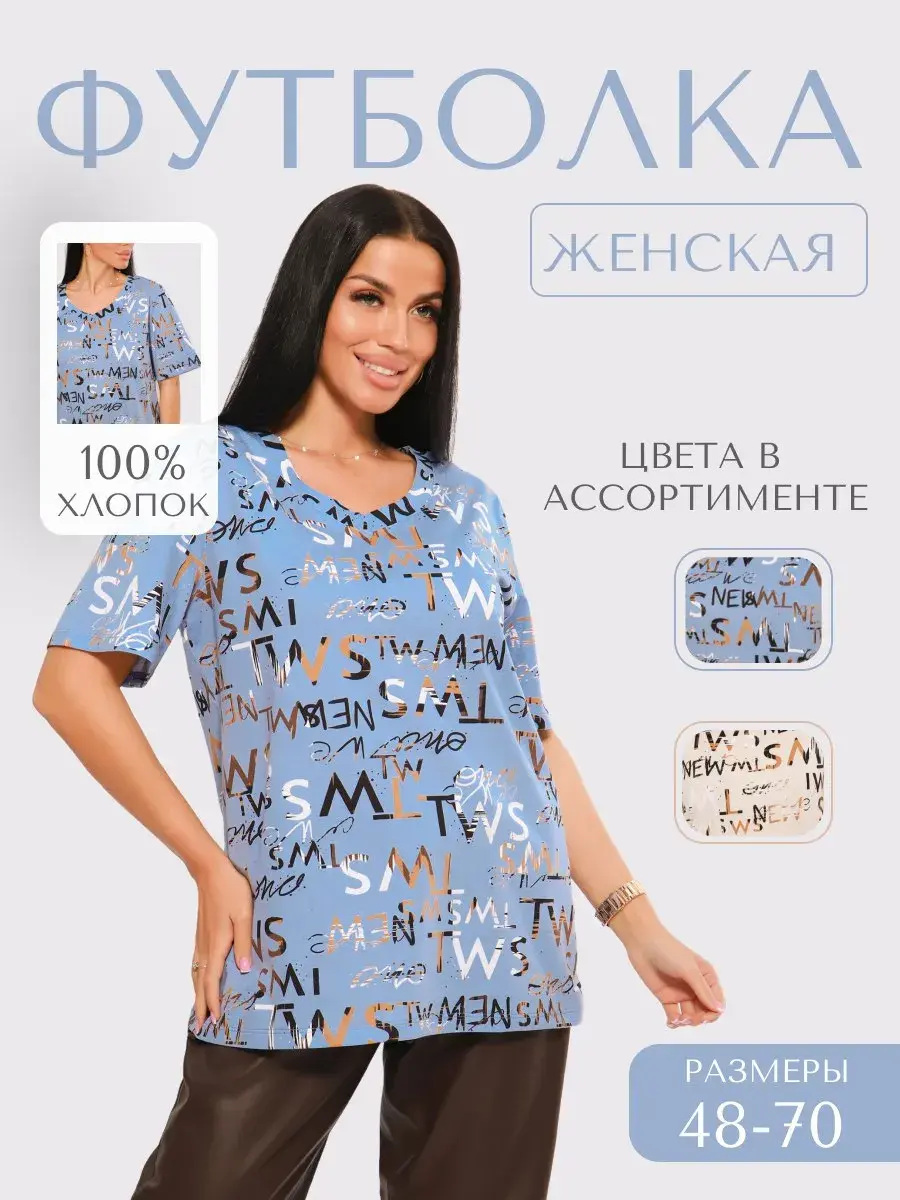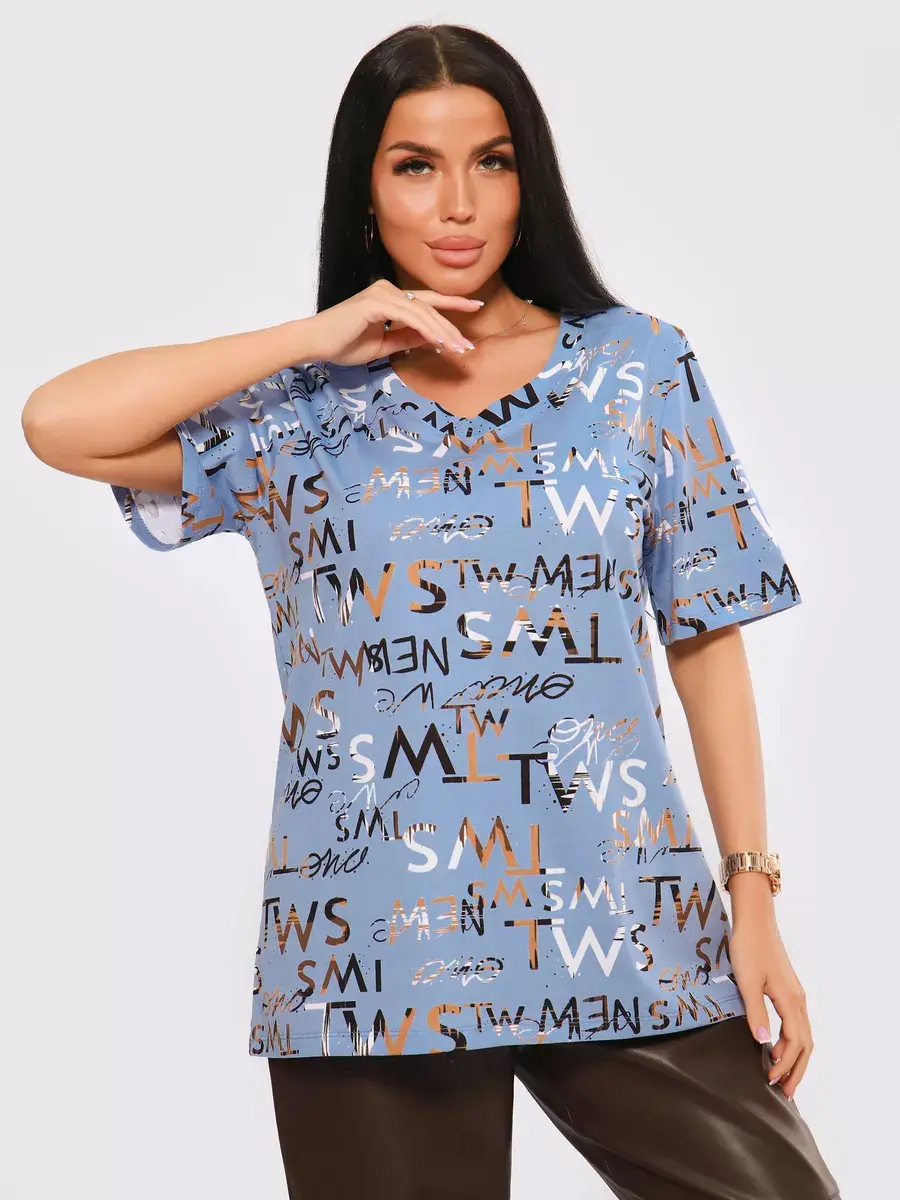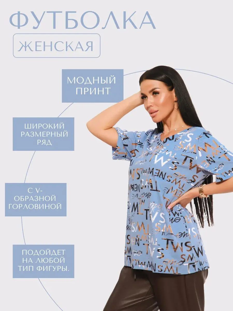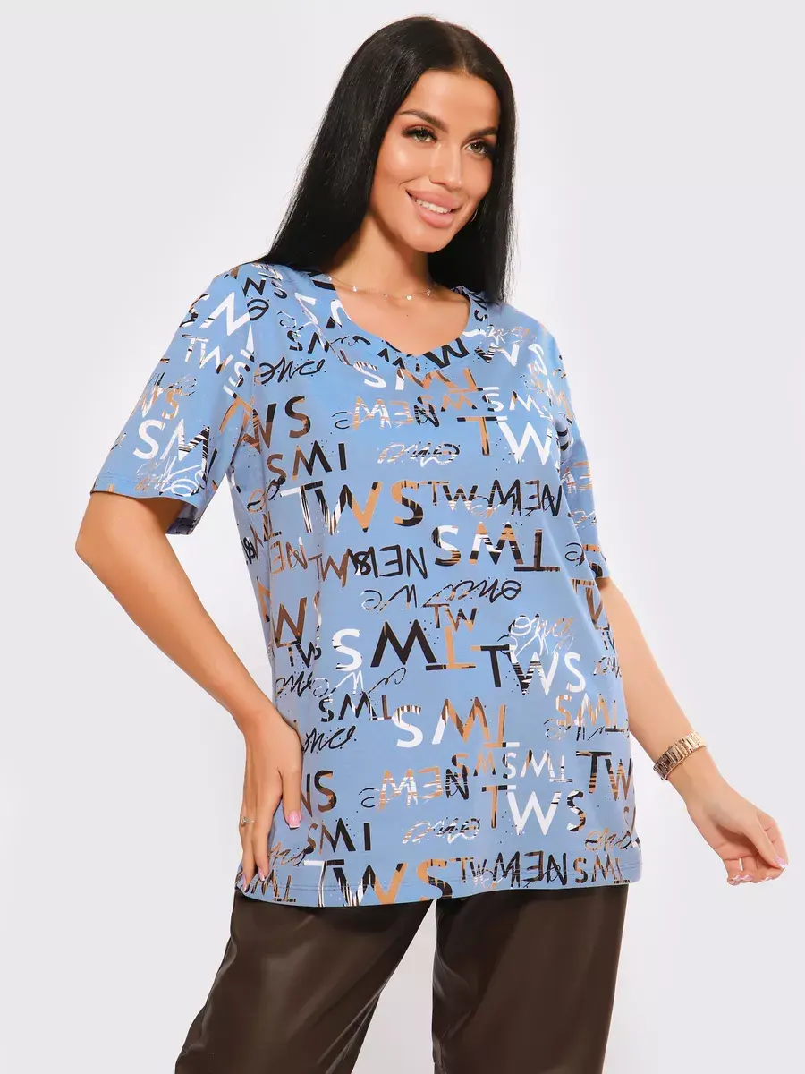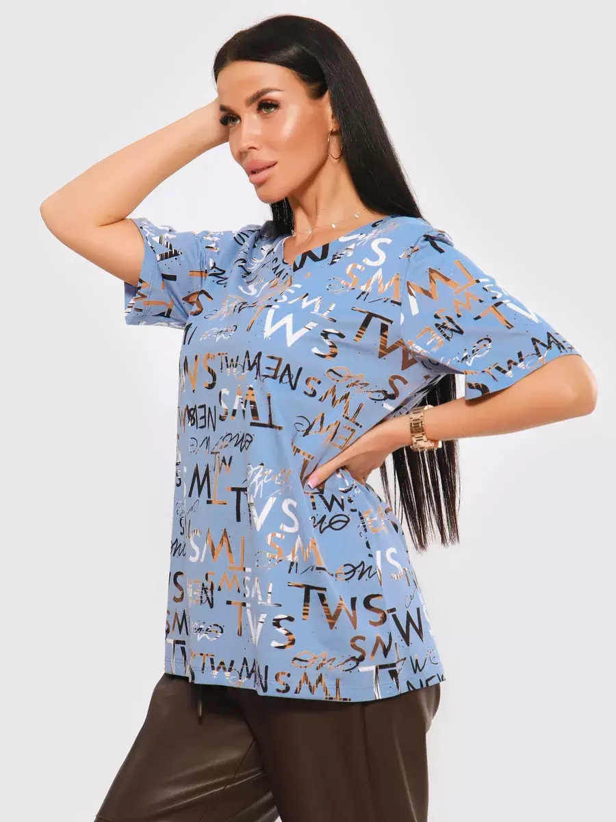 Футболка женская из хлопка с лайкрой, производства Турции. Модель футболки удлинённая с V-образной горловиной, подойдет на любой тип фигуры. Модный принт на ткани футболки будет отлично сочетаться с любым низом. Футболка свободная имеет широкий размерный ряд с 48 по 70 размер, позволит подобрать Вам подходящий размер. Желаем удачных покупок!