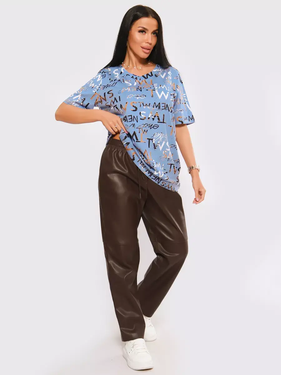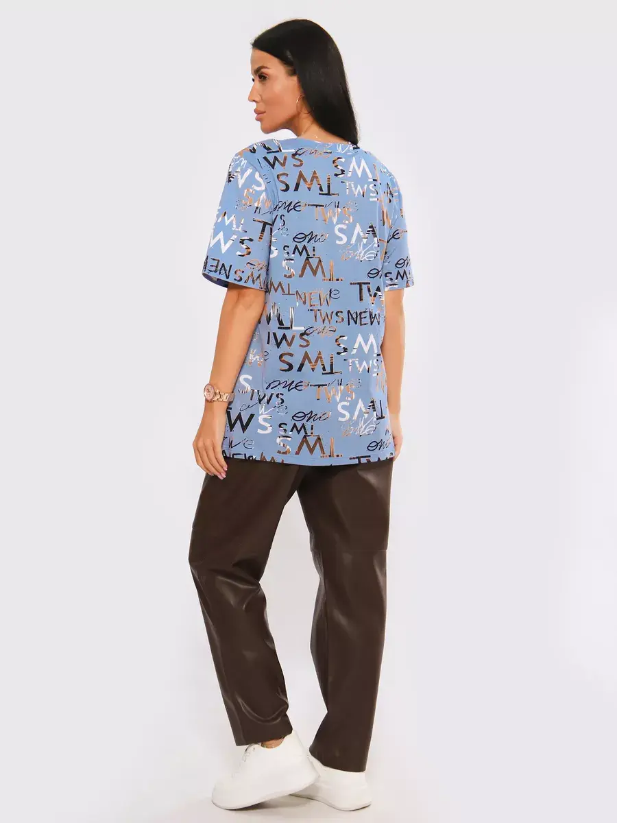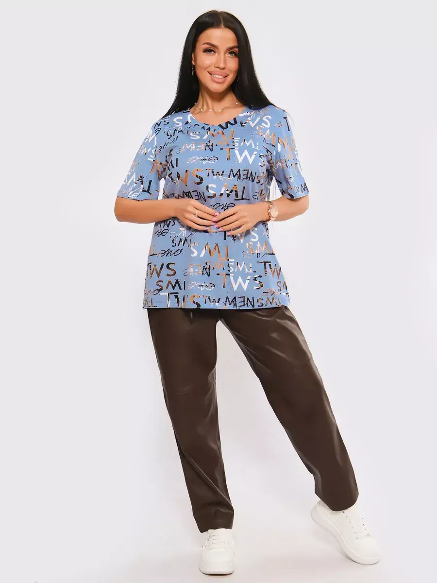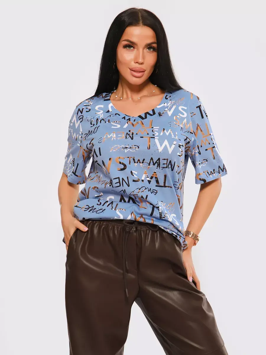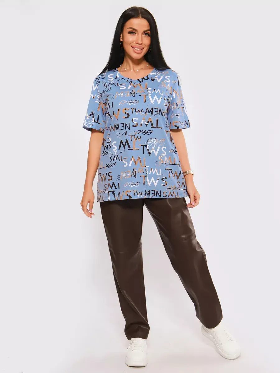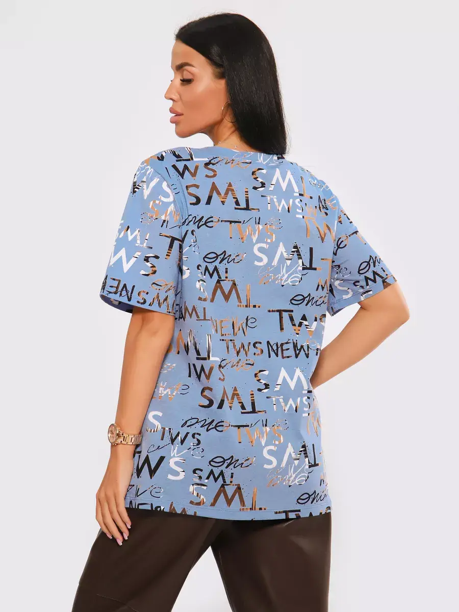 Футболка женская из хлопка с лайкрой, производства Турции. Модель футболки удлинённая с V-образной горловиной, подойдет на любой тип фигуры. Модный принт на ткани футболки будет отлично сочетаться с любым низом. Футболка свободная имеет широкий размерный ряд с 48 по 70 размер, позволит подобрать Вам подходящий размер. Желаем удачных покупок!