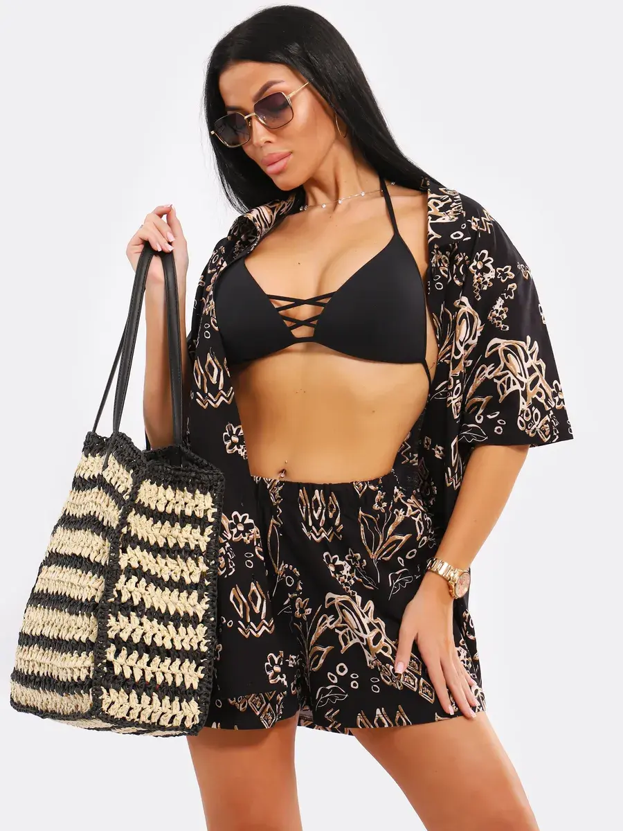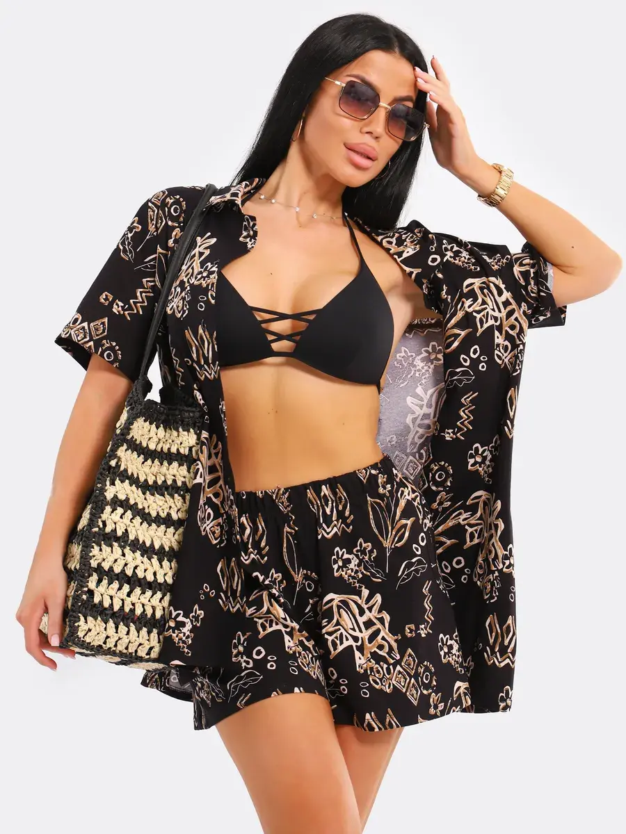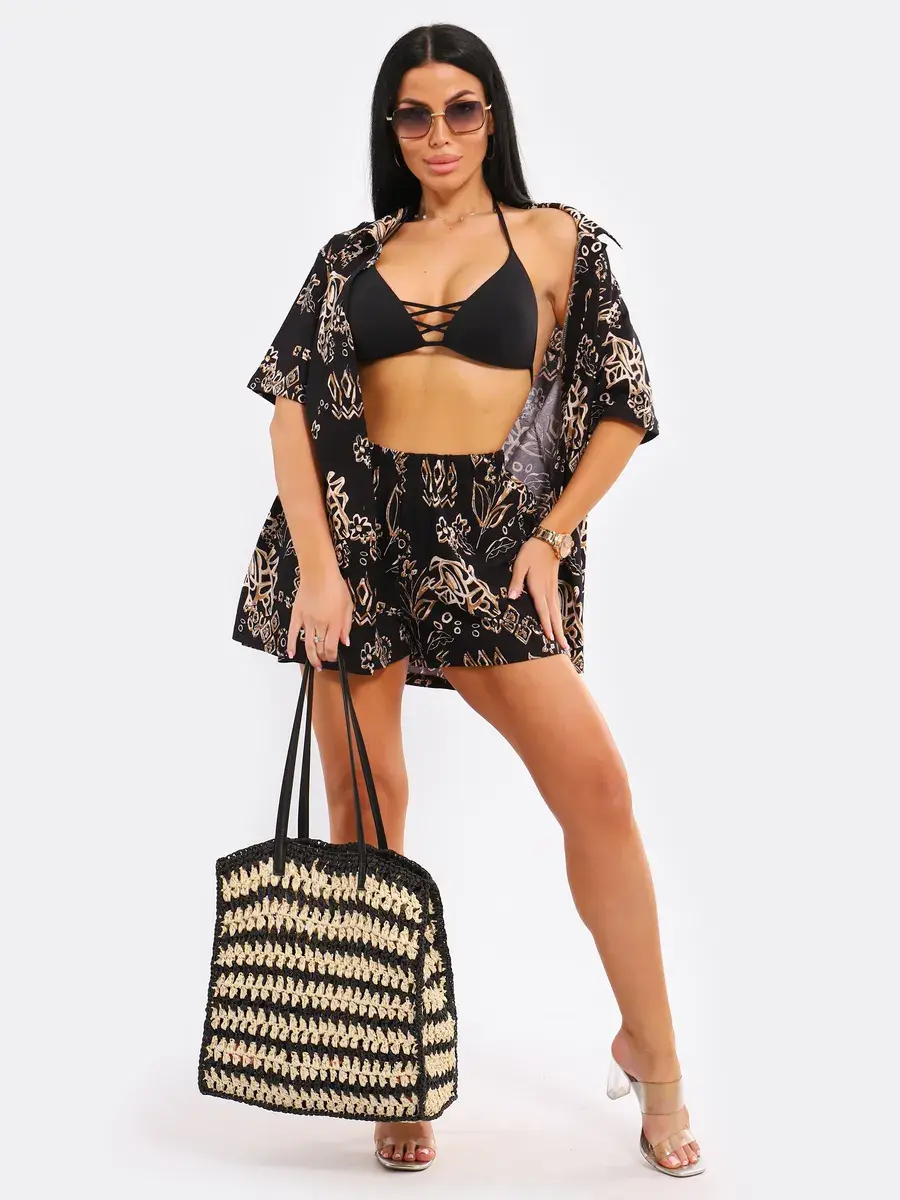 Легкий пляжный комплект в пижамном стиле подчеркнет вашу индивидуальность. Вы можете носить удлиненную рубашку оверсайз вместе с шортами или сочетать ее с другими элементами одежды.