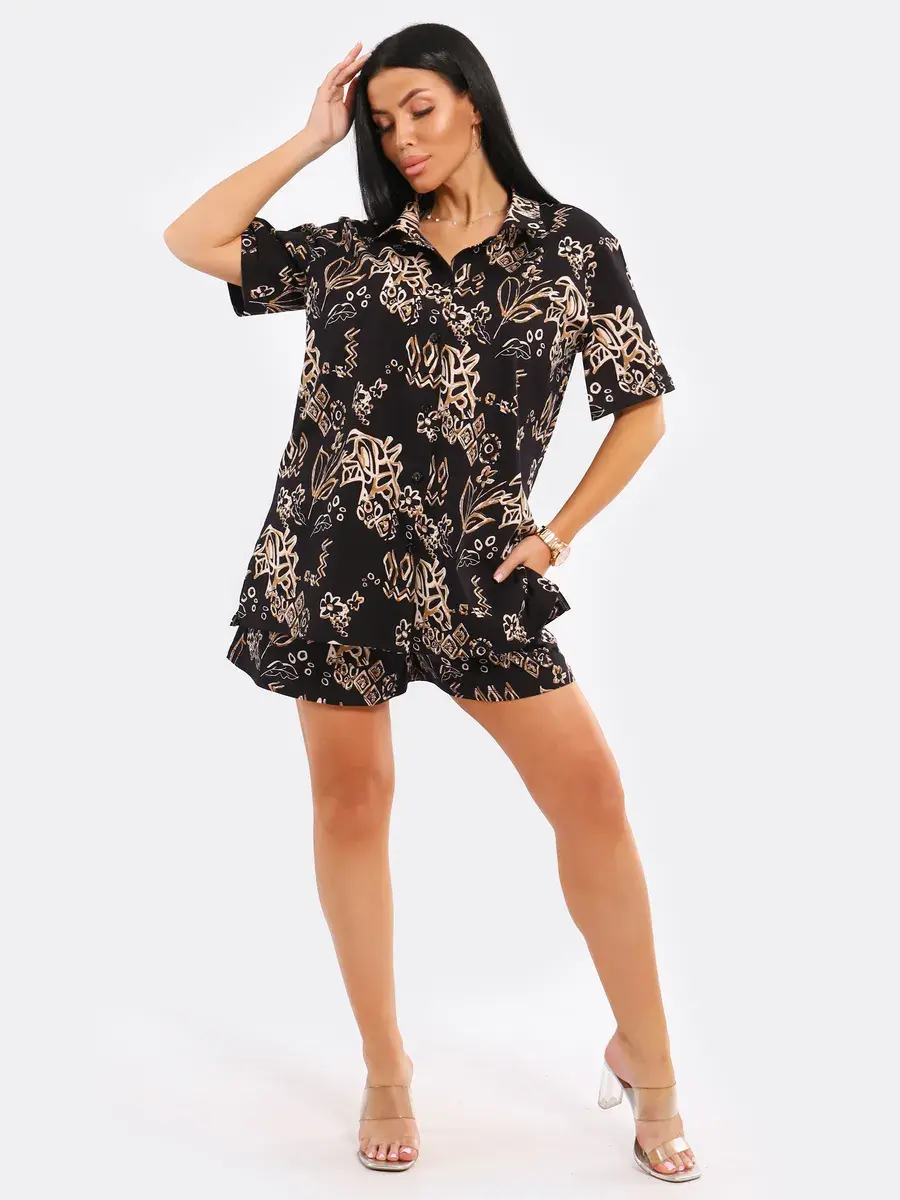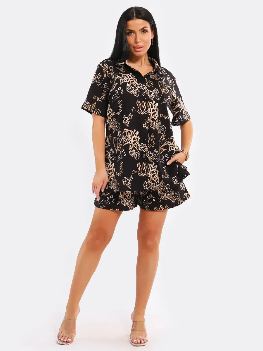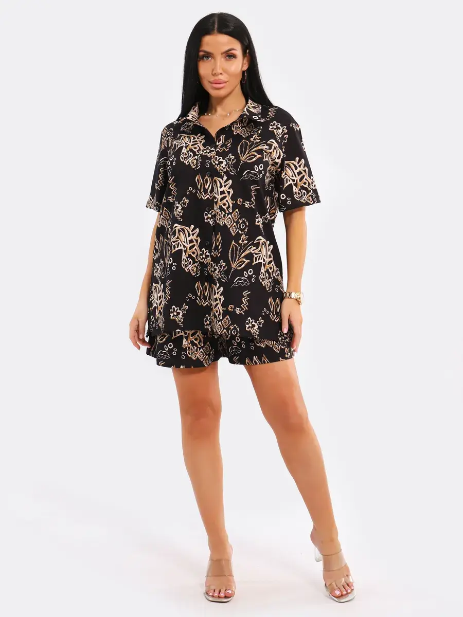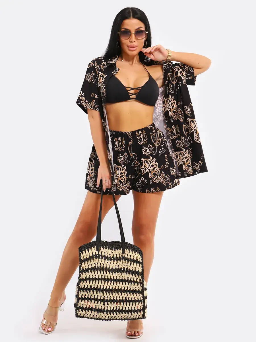 Легкий пляжный комплект в пижамном стиле подчеркнет вашу индивидуальность. Вы можете носить удлиненную рубашку оверсайз вместе с шортами или сочетать ее с другими элементами одежды.